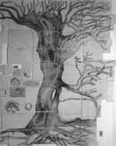 peintures réalisées à partir de 1986, conçues comme des accumulations d'écritures, de dessins et de photographies. Sortes de grandes narrations, elles sont une mise en forme ludique et poétique de l'ensemble des préoccupations de l'artiste, scientifiques, économiques, écologiques, météorologiques. Processus d'élaboration de la pensée de l'artiste, elles témoignent en même temps de son désir de rendre visuel son cheminement mental. Les peintures homéopathiques témoignent de la place accordée par l'artiste au dessin et à la peinture, fondement de son uvre proliférante qui se déploie par glissements successifs, correspondances et hybridation.