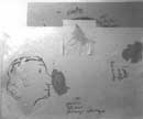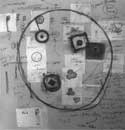 peintures réalisées à partir de 1986, conçues comme des accumulations d'écritures, de dessins et de photographies. Sortes de grandes narrations, elles sont une mise en forme ludique et poétique de l'ensemble des préoccupations de l'artiste, scientifiques, économiques, écologiques, météorologiques. Processus d'élaboration de la pensée de l'artiste, elles témoignent en même temps de son désir de rendre visuel son cheminement mental. Les peintures homéopathiques témoignent de la place accordée par l'artiste au dessin et à la peinture, fondement de son uvre proliférante qui se déploie par glissements successifs, correspondances et hybridation.