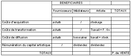 Ainsi est-il possible pour l'artiste de vérifier dans quelle direction portent financièrement ses efforts, et si un équilibre économique est respecté entre les différents bénéficiaires lors de l'établissement du prix de ses uvres.