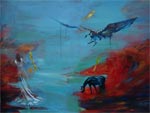 Solange Galazzo a transposé cette histoire qui est plutôt une méditation sur un état de l’être selon plusieurs procédures. La première a été de fournir des images fortes de ce lieu qui, a priori, nous ne pourrions voir. Un exercice mental en somme. Mais très matériel. Dans une toile, elle choisit une gamme chaude, dans une autre, une gamme froide, avec des bleus et des bruns, et plus tard, elle a tenté de nous faire éprouvé les sensations que distille le sol des sous-bois où nichent les petites colonies de ces bestioles charmantes. Cette fois, on est face à un plan de couleurs allant du rouge au bleu, avec l’impression de tendres reliefs et d’une humidité pénétrante. C’est sous ce tapis constitué surtout de feuilles et de résidus végétaux qu’elles parviennent à trouver refuge. Enfin elle a peint un homme taupe, qui possède à la fois quelque chose qui est une intelligence affutée et, aussi, une solitude qui est le fruit d’une peur qui ne le quitte jamais. Kafka a humanisé sa taupe, tout comme Buffon.