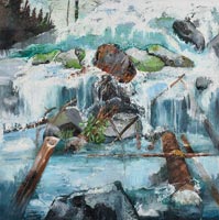 Bien qu’absente de cet espace feuilleté de paysages, la figure humaine est présente par le spectateur qui se retrouve à l’intérieur d’une nature sauvage, composée selon le principe « all over ». La cascade bleue évoque ainsi des panoramas cinématographiques. La forêt fait écho à des paysages déjà vus. Ces tableaux apparemment réalistes appartiennent au nouveau cycle de Fred Kleinberg sur le paysage. L’artiste procède par thème, qu’il élabore pendant deux à trois ans et qui constitue une vision idéale d’une exposition. Son univers pictural se nourrit autant de ses lectures actuelles sur la géopolitique, des événements marquants que des expériences de voyages réels et imaginaires. Fred Kleinberg se souvient d’une fête bouddhiste consacrée à l’eau en Birmanie. La peinture figurative est son moyen d’expression, d’écrire son journal, elle se réfère ici autant à la tradition de Courbet qu’à Hokusai, qu’aux films récents. La mythologie personnelle de « GERMINATION » est issue de sa réflexion de l’être au monde, au sens d’une transformation permanente.