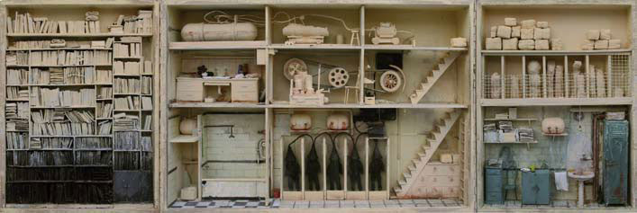 ![]() Marc Giai-Miniet, Boîte jaune pliable, 42 x 120 x 10 cm. Les « boîtes » présentées ici sont apparues assez tardivement dans mon travail de peintre, comme un prolongement naturel et nécessaire, et en sont devenues un élément indissociable, son double ludique. Comme une réminiscence de mon désir d’adolescent de faire du théâtre, et peut-être même du plus profond encore de mes souvenirs, de jeux d’enfant entre batailles rangées de figurines, trains électriques, fermettes et crèche de Noël. Ces « boîtes », au départ de leur fabrication dans les années 92-93, reprenaient les thèmes de mes tableaux : scène du décervelage, visite aux momies, agitation des larves et transfusions diverses. Des petits personnages découpés dans du carton figuraient le ballet ironique et existentiel de ma peinture. Au fil du travail, les constructions devenant de plus en plus grandes, les personnages ont disparu et des livres, des bibliothèques entières ont pris place conjointement aux laboratoires, aux salles de stockage, d’attente ou d’interrogatoires, aux cellules, escaliers, coursives, fours, égouts ou quais de partance… Je comprenais que le garage où travaillait avec peine mon père, un antre noir, obscur et mystérieux, faisait écho à l’incendie de mon premier atelier qui décapita la maison puis, bien plus tard, aux tombes égyptiennes enfouies dans la terre. Je comprenais également que les livres brûlés, ainsi figurés, étaient la métaphore douloureuse de la vie des hommes, à la fois esprit et matière et voués inexorablement à leur destin. Car non seulement les livres peuvent être brûlés mais parfois aussi, par la connaissance transmise, ils nous « brûlent », nous métamorphosent, nous accompagnent ou nous égarent… dans une vision devenue « existentiale ». Partout sur la Terre la pensée humaine s’est bâtie sur des livres fondamentaux revendiqués par les saints aussi bien qu’instrumentalisés par les tyrans. Les hommes témoignent dans leurs livres