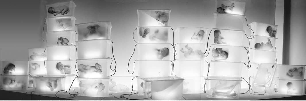 1) David Le Breton, « Imaginaires de la fin du corps », Le passant ordinaire n°42, novembredécembre 2002, p. 35 2) Hans Belting, Le chef d’oeuvre invisible, Nîmes, Jacqueline Chambon, 2003, p. 275 3) Ibid. 4) Productos Navares, garantia de seduccion, 1999, 57 x 39 x10 cm, cibatrans, double image, caisson lumineux 5) Complementos para un fin de semana, 1998, 21 x 28 x 18 cm, 7 photographies cibatrans, sac et boites en plastiques, urne de métacrylate. 6) Autoretrato con implantes 3, 1996, 10 x10 cm, cibachrome 7) Santiago Olmo, « Laboratoires du corps », Stand By, catalogue 8 La double image permet une animation par le déplacement du spectateur, c’est elle lui permet de donner l’impression que les paupières se ferment. 9) Milenia ; del corazon y el artificio, 1998, installation de lumière fluorescente et phosphorescente, photographies, mannequin, rideaux, matériel chirurgical et matériel industriel. |