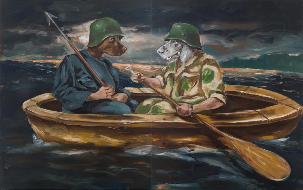 L’anathème et l’ironie seraient plus acceptables par le biais d’un autoportrait déguisé ? Notre sens de l’humour est mis à l’épreuve. Pourra-t-il rencontrer celui de Forstner ? Sommes-nous capables de vivre avec nos monstres ? Les chiens font partie du patrimoine artistique et littéraire inclus dans le thème récurrent du bestiaire. Ils sont nous-mêmes, mais à travers eux, nous ne nous sentons pas directement visés. Il faut une parade pour nous atteindre, un chemin détourné pour parler de nous à nous. Le roi, sous la plume habile de La Fontaine, revêtait l’habit du corbeau, de la cigale, du renard, du loup… Les chiens, personnifiés à la manière des illustrations populaires, de parties de poker et de billard, de Sarnoff et Coolidge ou des caricatures de presse, nous imitent jusque dans nos gestes et nos expressions les plus intimes. Les beaux toutous ne vont pas nous mordre. Les queues décontextualisées de leur salle de jeu sont d’autres queues sur d’autres terrains de jeu. Ces nouveaux reflets à la Narcisse, nous les tenons ainsi à distance. Les trajets de leurs regards rappellent ceux de la peinture classique et les lignes qu’ils dessinent. Dans chaque toile, chiens ou personnes des séries de soldats, Fisherman, Scènes de ménages, du Goûteur, aux Mélancoliques… nous sommes pris à partie, forcés d’endosser le rôle du témoin. Soit qu’un personnage nous interpelle, soit que son regard ou son index nous indique la voie que doit suivre le nôtre. Le jeu de piste crée une confusion ordonnée. L’humour flirte avec le malaise. Le sens est recomposé.