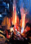 C'est une singulière vision de l'Italie qu'offre au regard la peinture de Mostyn-Owen. C'est tantôt la musique d'un imaginaire lyriquement poétique qui s'y joue. Avec « Petriolo » (2008), les personnages réunis autour d'un feu portent la réminiscence de déambulations nocturnes en terres italiennes, au cœur de quelques monastères en ruines. S'y opère la fusion d'une matière devenue chair unie. Chair de nuit qui étreint et consume, et figures et flammes. Elle dit l'immanence d'un instant où mystérieusement, au dedans, se mêlent puis s'embrasent les sens et les perceptions extérieures. Ce sont parfois l'Histoire et les mythes qui sont librement réinventés, avec humour ou ironie. Là, le « Tagesreste » (2009), dont nous avions déjà parlé lors de l'exposition personnelle du peintre chez Polad-Hardouin à Paris. Inscrit dans un paysage où il n'a pas sa place, le Minotaure y apparaît, corps minéralisé, disgracieux et maladroit, comme une force inutile, absurde. Ici, les « Carabinieri » (2007). Des policiers italiens y sont représentés sur un fond digne d'un décor de théâtre (ciel bleu et colonnade). Chaussures lustrées, air arrogant, corps enchevêtrés et matraque levée, telle une masse monstrueuse et menaçante, ils sont autant ridicules qu'inquiétants. Là se révèle le symbole d'un Pouvoir dont la responsabilité dans des actes de violences n'a de cesse d'être cachée derrière l'image - pure fiction - de la belle Italie. Ils chuchotent sournoisement, en coulisses, un chant obscur et refoulé quand se donne en spectacle, cantatrice dissimulatrice, la voix de la Dolce Italia. Écoutez !, en ce pavillon-là, c'est particulièrement détonant.