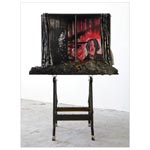 Le "dos" du théâtre peint lui aussi fait face à une autre peinture (La chambre rouge), au mur, qui est une superposition de deux gravures de Dix (le suicidé (le pendu) et le crime sadique). Tout ça " vu" à travers un filtre rouge liant les pièces et les récits superposés. Le spectateur passe physiquement à travers un système de connexion et une mise en scène d'un théâtre de la cruauté et séduisant malgré tout. La présence des barbelés, clin d'œil, entre autres, au ministère de l'amour dans 1984 d'Orwell, devient lignes liant l'avant et l'arrière de la pièce, espace/peinture transpercé.