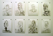 La démarche de l'artiste est volontairement simple, le regard qu'il pose sur les images et objets quotidiens est acéré, son esprit gauguenard est palpable. L'exposition est parcourue par le registre de la parodie et de la satire, à l'image de la série de caricatures que l'artiste a fait faire de lui-même à Madrid en 2010 par différents dessinateurs. Ce plaisir de la dérision et cette volonté de pasticher la réalité se manifestent également dans une série de peintures à l'huile que l'artiste a 'ajustées' à sa manière: des nez rouges, des yeux qui louchent sur des portraits classiques, des barres noires de censure sur un nu allongé. Ces ajouts malicieux nous ramènent inévitablement au début du 20ème siècle et aux ready-mades de Marcel Duchamp qui en 1919 avait ajouté au crayon une moustache et une barbe sur une reproduction de 'La Joconde' de Léonard de Vinci.
