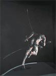 L’ensemble des quatre tableaux a d’abord été daté 1983. Il avait été exposé, photographié, commenté. Cependant, en septembre 1985, la Grande Poursuite n’était plus la même (Velickovic finira par la dater 1986, et il enlèvera la petite toile finale). Je la retrouvais dans l’atelier de Velickovic en pleine opération de recréation (elle durait depuis des mois). C’est que le peintre n’avait jamais fini de reprendre la matière de ses tableaux (la matière, bien plus que les formes) pour lui donner une intensité maximale. Les clairs-obscurs, cent fois peints, finissaient par conférer une présence sculpturale aux corps. Loin des détails anatomiques autrefois traités avec le réalisme d’un biologiste, les muscles semblaient taillés dans la pierre. La touche, plus libre, était mieux visible, qui affleurait au terme d’une superposition complexe de couches de pigments. Ce qui était déjà réalisé deux ans plus tôt ne satisfaisait donc pas l’artiste (« il n’est pas bon que l’artiste soit content » enseignait Léonard). Devant cet acharnement à se rapprocher d’une certaine idée de la perfection en art, comment ne pas penser à Giacometti tel que le perçut Jean-Paul Sartre ? « Il pouvait gagner la partie sur l’heure : il n’a qu’à décider de la gagner. Mais il ne peut s’y résoudre, il remet sa décision d’heure en heure, de jour en jour ; parfois, au cours d’une nuit de travail, il est tout près d’avouer sa victoire : au matin tout est brisé. Craint-il l’ennui qui l’attend de l’autre côté du triomphe, cet ennui qui morfondit Hegel lorsque celui-ci eut imprudemment bouclé son système ? »